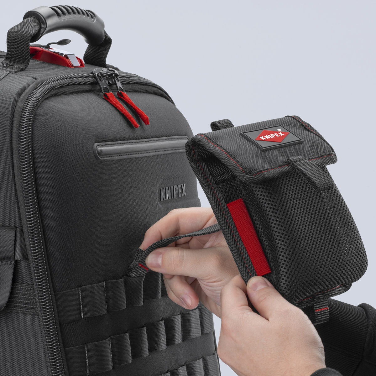 Podijeljenja na glavne dijelove I unutrasnji dzep od zada. Sa dvije dugotrajne kopce od konopa sa MOLLE kacistima za 00 21 50 Knipex modularni x18 ruksak za alat. Moze se koristiti kao torbica za pojas. Idealan za potrosni materijal. Dimenzije:190 x 135 x 40 mm.